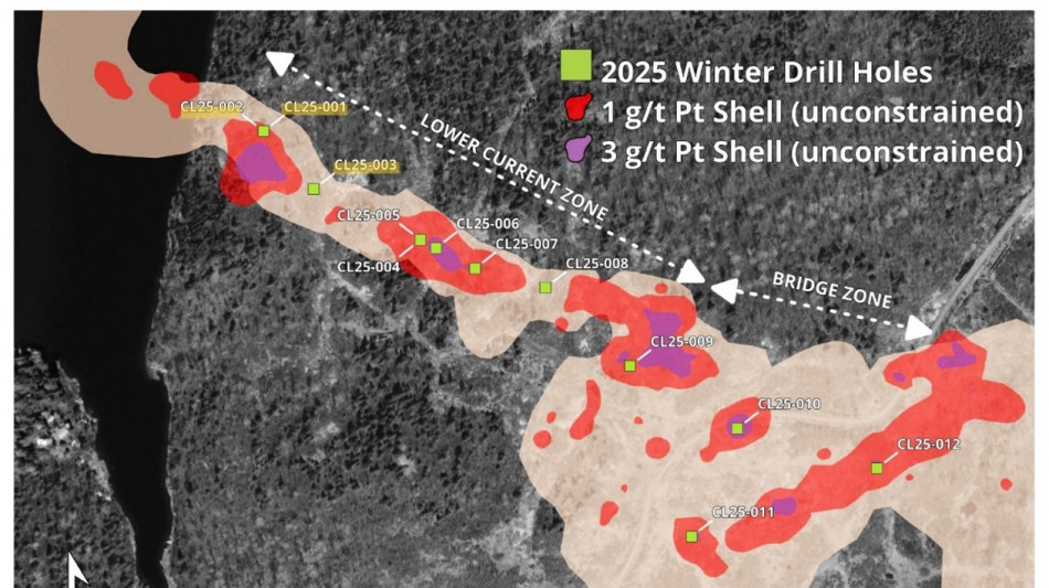 21.4 m of 2.71 g/t Pt, 2.41 g/t Pd, 0.53% Cu and 0.28% Ni(7.64 g/t Pt.eq1; 2.56% Cu.eq2) from 96 m downhole in Hole CL25-002, including