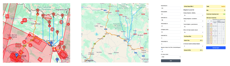 Motor de cálculo SAIL: Cuantifica el riesgo aéreo y terrestre en los corredores de entrega utilizando datos de densidad de población, orografía e infraestructuras críticas.